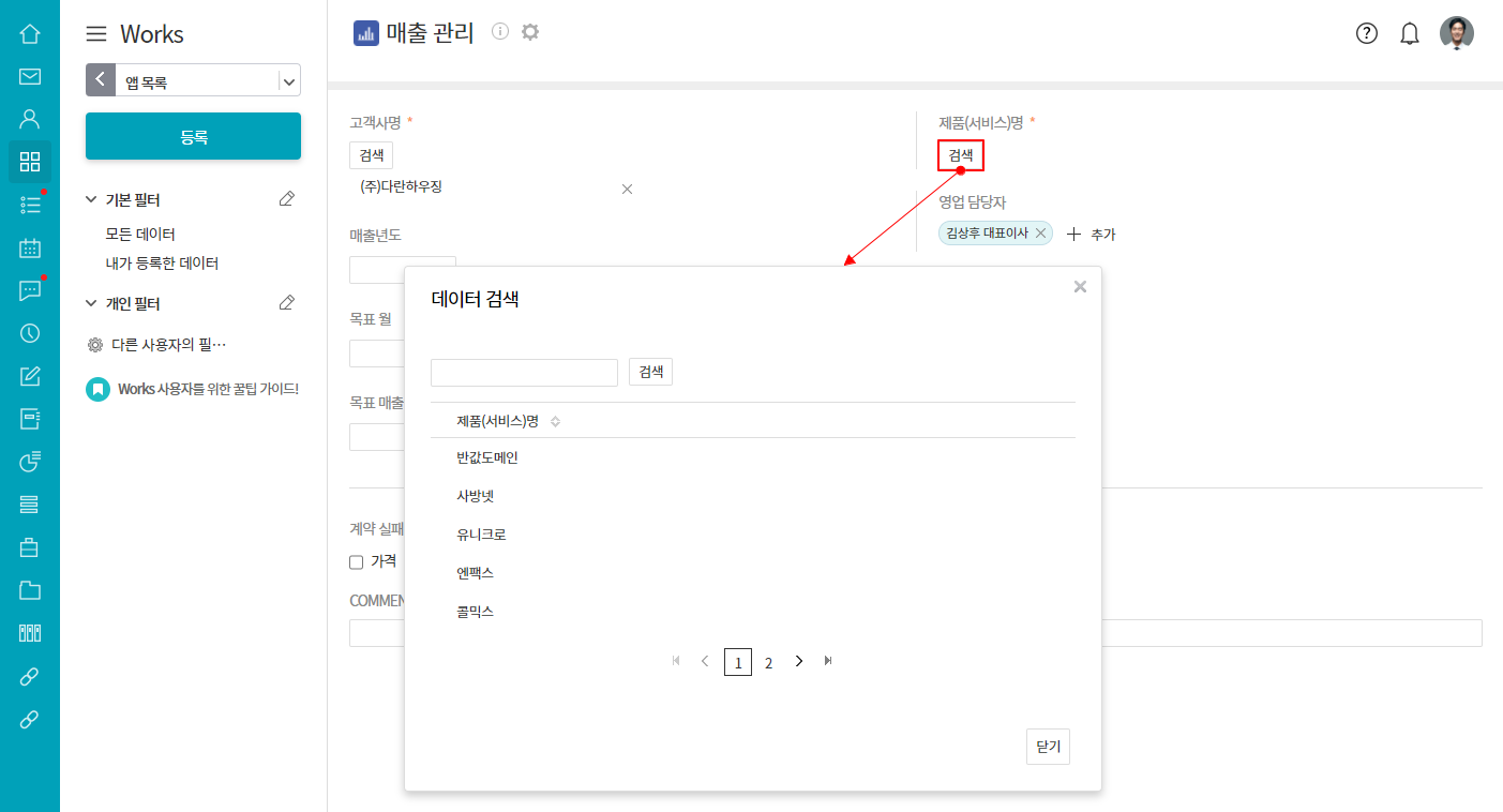⑦ 데이터 등록 시 검색 버튼을 통해 다른 앱에 있는 데이터를 가져올 수 있음.