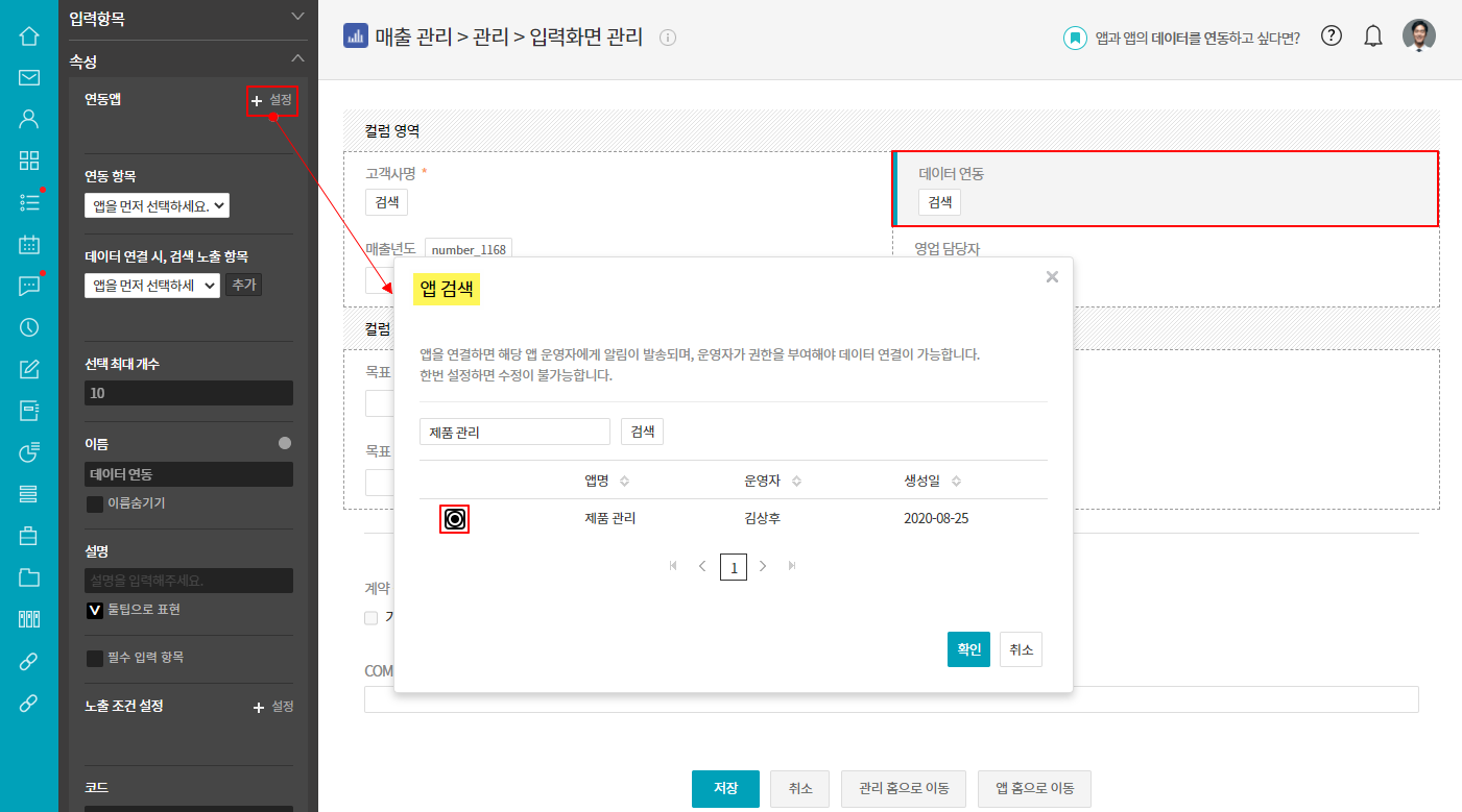 ⑤ 추가한 [데이터 연동] 항목 클릭 ▷ 연동앱 ▷ + 설정 ▷ 앱 검색 ▷ '제품 관리'앱 선택 ▷ 확인