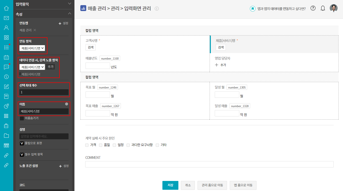 ④ 연동 항목 : 고객사명 ▷ 데이터 연결 시, 검색 노출 항목 : 고객사명 ▷ 선택 최대 개수 : 1 ▷ 이름 : 고객사명