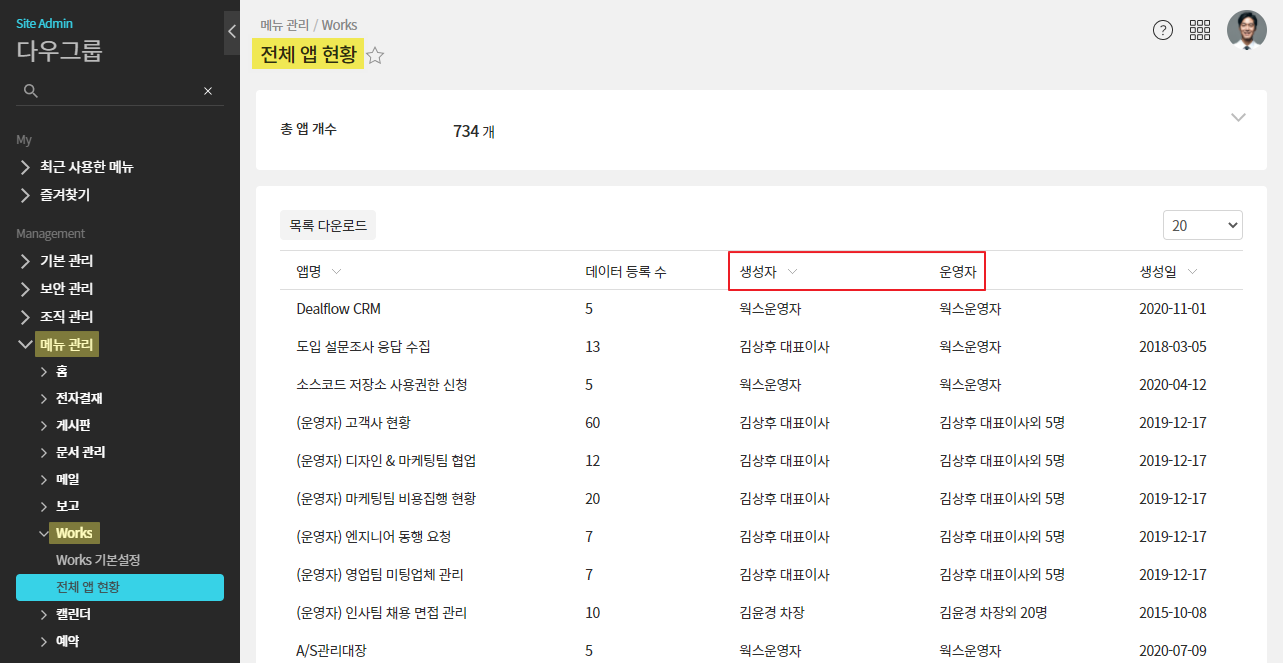 관리자페이지(SiteAdmin) ▶ 메뉴관리 ▶ works ▶ 전체 앱 현황 ▷ 앱 별로 생성자와 운영자 확인