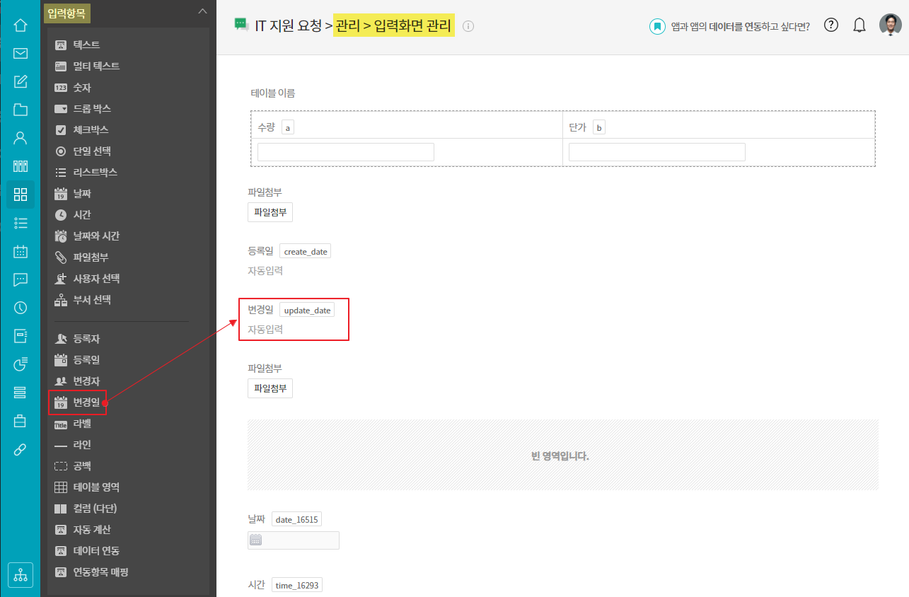works ▶ 관리화면 ▶ 입력화면 ▷ 입력항목 ▷ 변경일 항목 추가