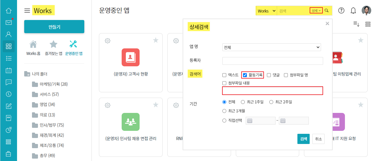 - Works ▶ 우측 상단 검색창의 상세▼ ▷ 활동기록 체크 ▷ 검색어 입력 ▷ 검색