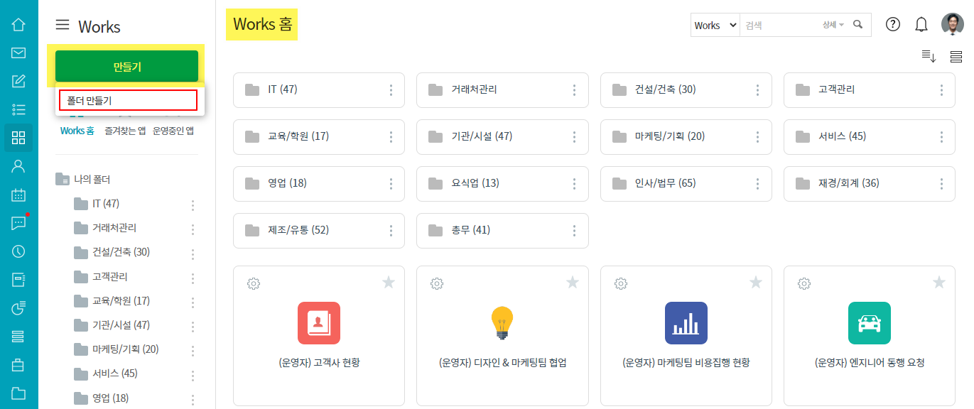 - Works 홈 ▶ 만들기 ▶ 폴더 만들기