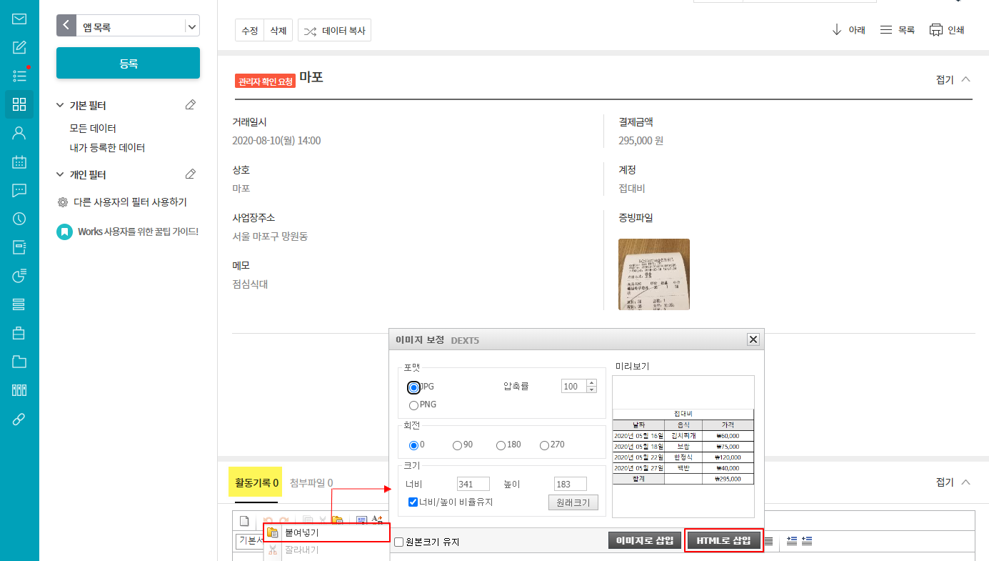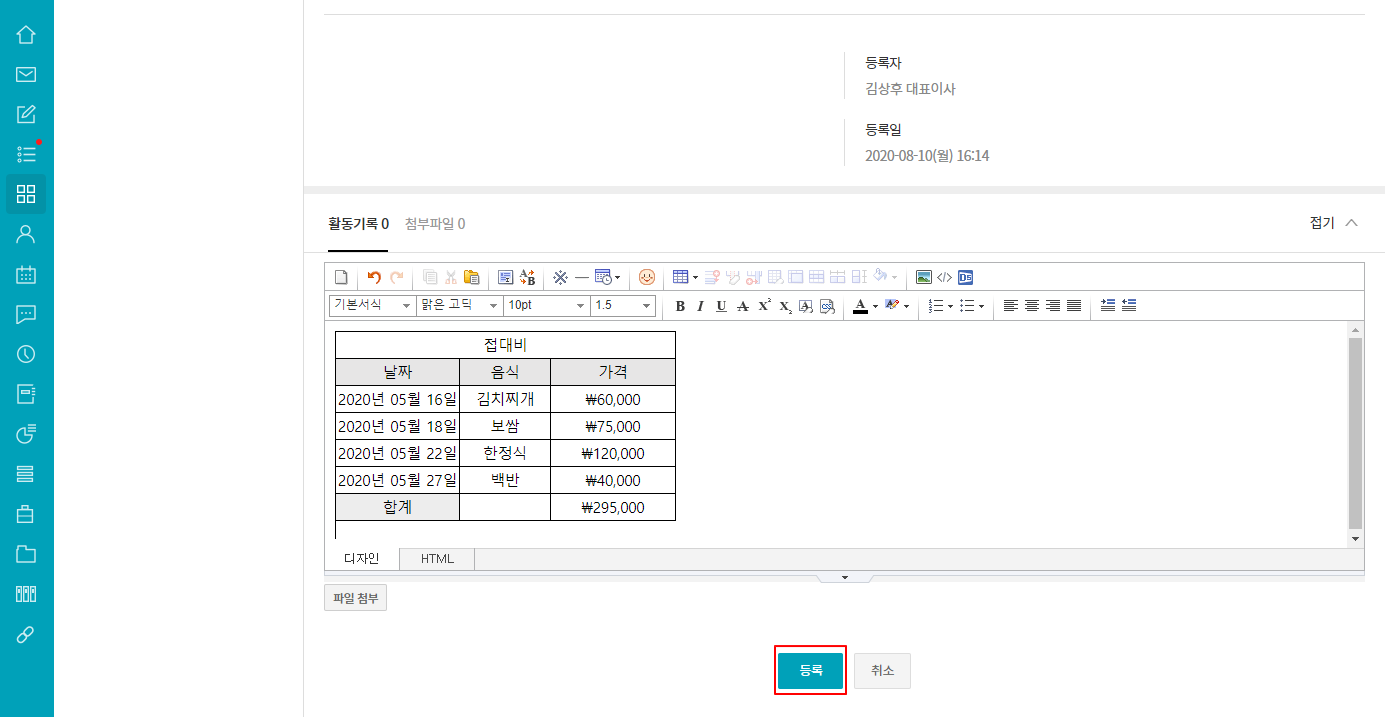 활동기록에 엑셀 표를 삽입할 수 있습니다.