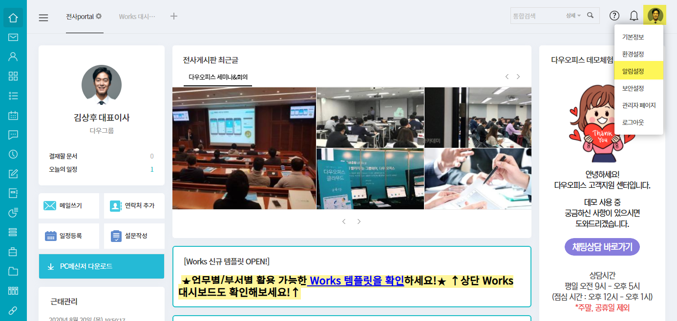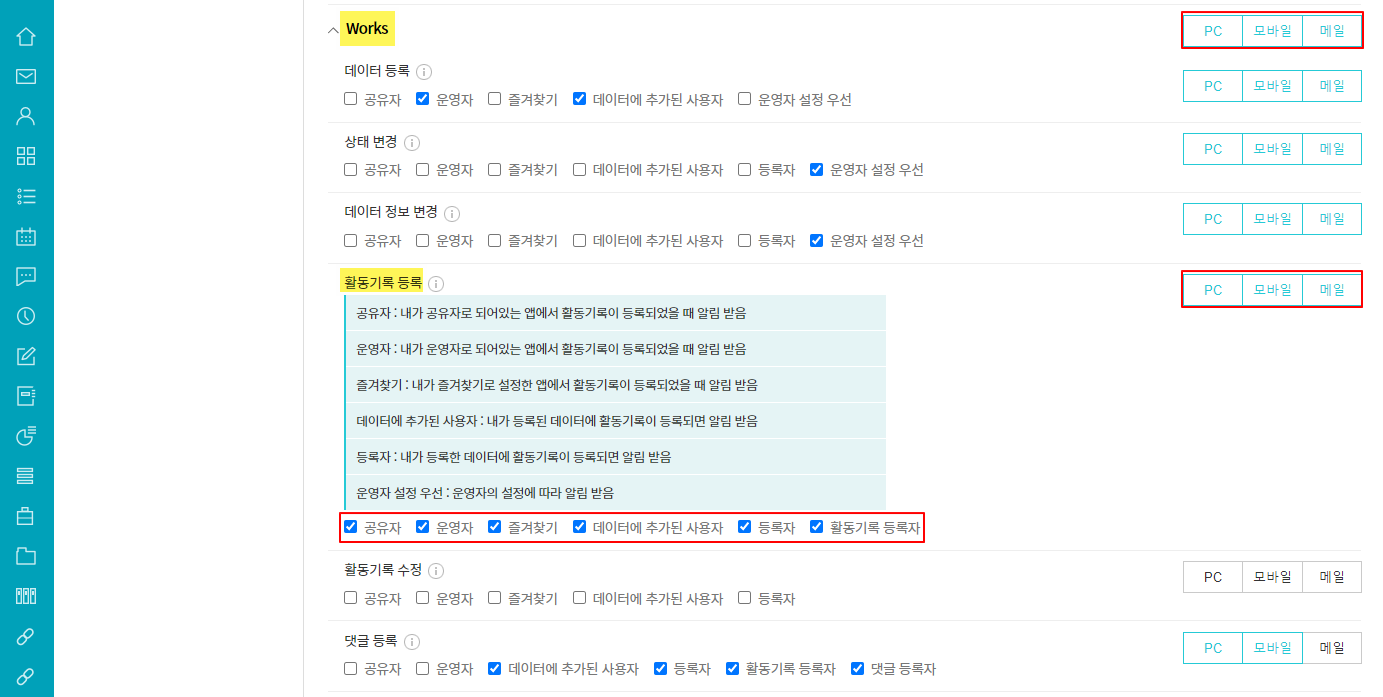 ② 메뉴별 알림 설정 ▷ Works ▷ 최상단의 알림설정(PC/모바일/메일 선택) ON