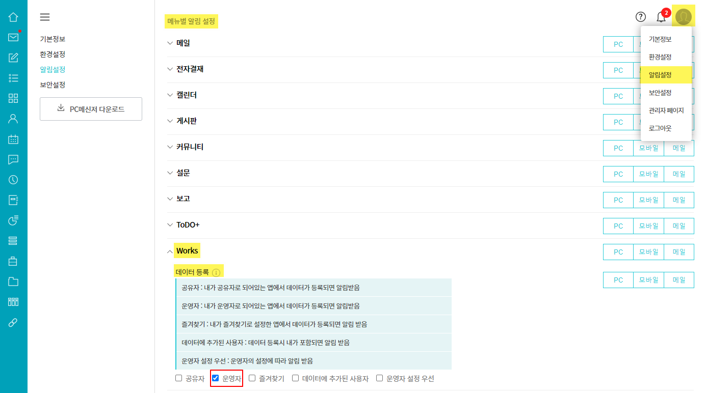 - 우측 상단의 프로필 사진 클릭 ▶ 알림설정 ▶ 메뉴별 알림 설정 ▷ Works ▷ 데이터 등록 ▷ 운영자 체크 ▷ 저장