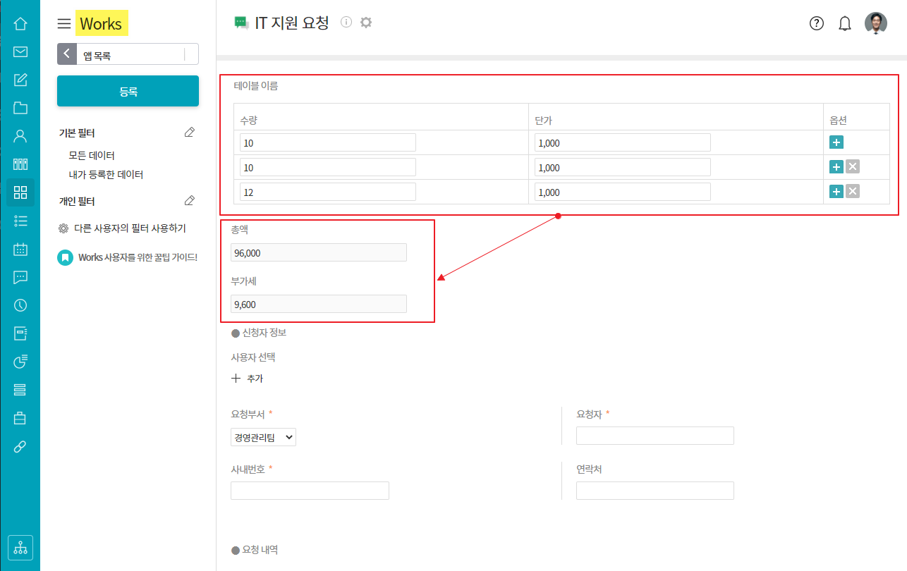 테이블영역에서 옵션 추가한 항목에 데이터 입력시 테이블영역내의 모든 항목이 자동계산됩니다.