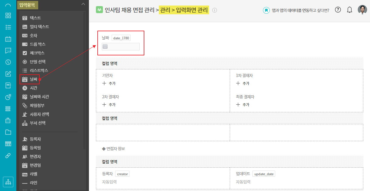 ① works ▶ 관리화면 ▶ 입력화면 ▶ 입력항목 ▷ 날짜/날짜와 시간 항목 추가