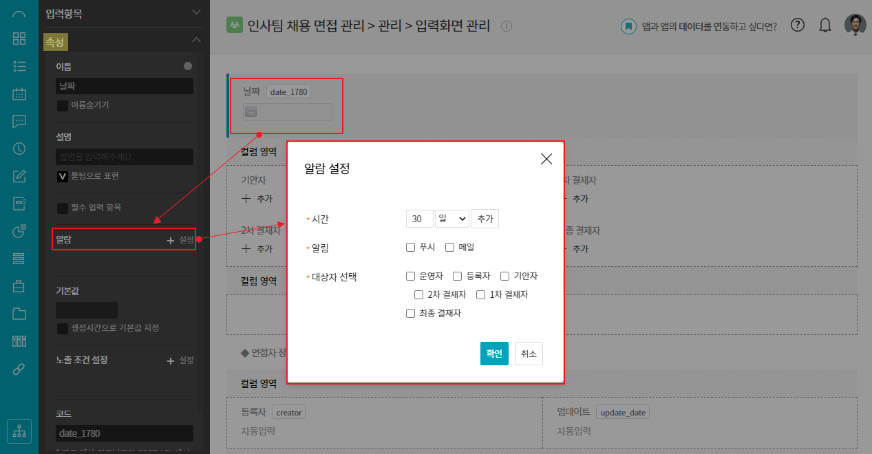 ② 추가된 날짜/날짜와 시간 항목 클릭 ▷ 우측의 속성 ▷ 알람 ▷ +설정 ▷ 알람 설정