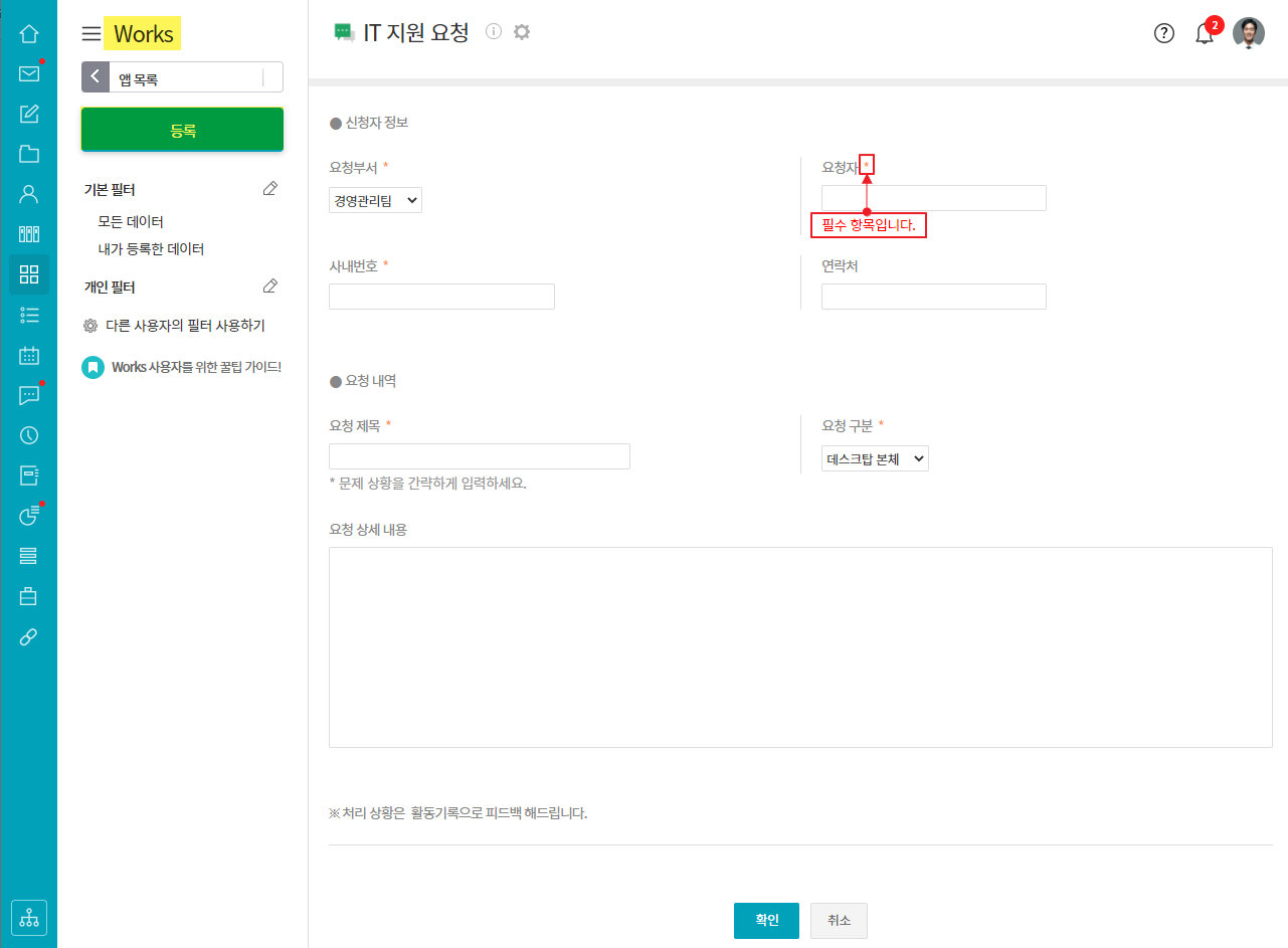 ■ 요약 필수항목으로 설정된 항목에 내용 미입력시 데이터가 저장되지 않습니다.항목 우측에 * 가 있을 경우 필수항목이기에 입력 후 저장하시기 바랍니다.