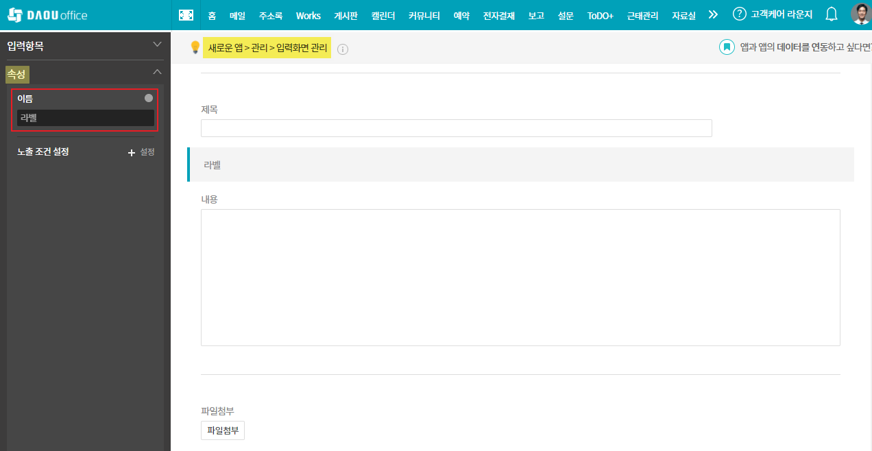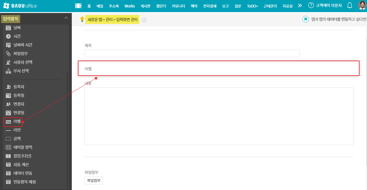 ① works ▶ 해당 앱 관리화면 ▶ 입력화면 ▷ 라벨 컴포넌트를 원하는 위치에 삽입
