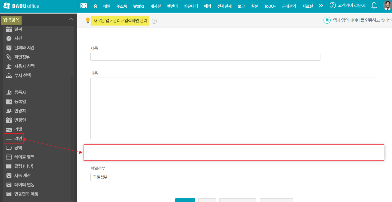works ▶ 해당 앱 관리화면 ▶ 입력화면 ▷ 라인 컴포넌트를 원하는 위치에 삽입