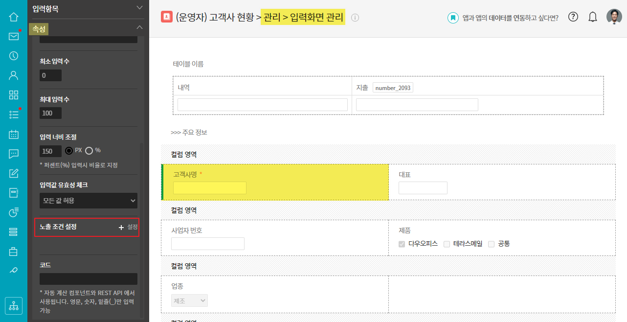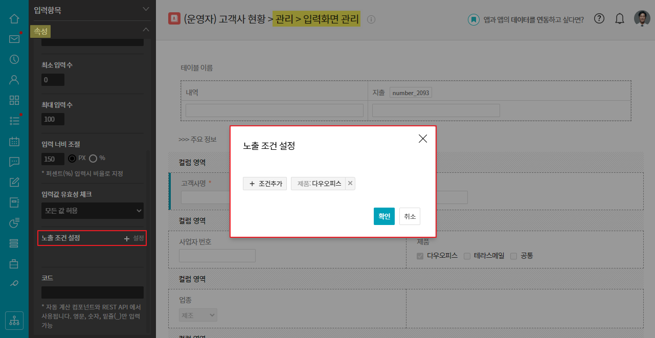 입력화면에서 노출조건 설정을 통해 특정 값에 대해 컴포넌트 노출 여부 설정이 가능합니다.