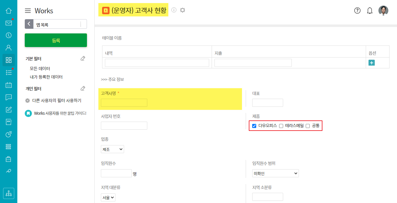 해당 앱 ▶ 등록 ▷ 선택조건 선택시 컴포넌트 노출 화면 확인