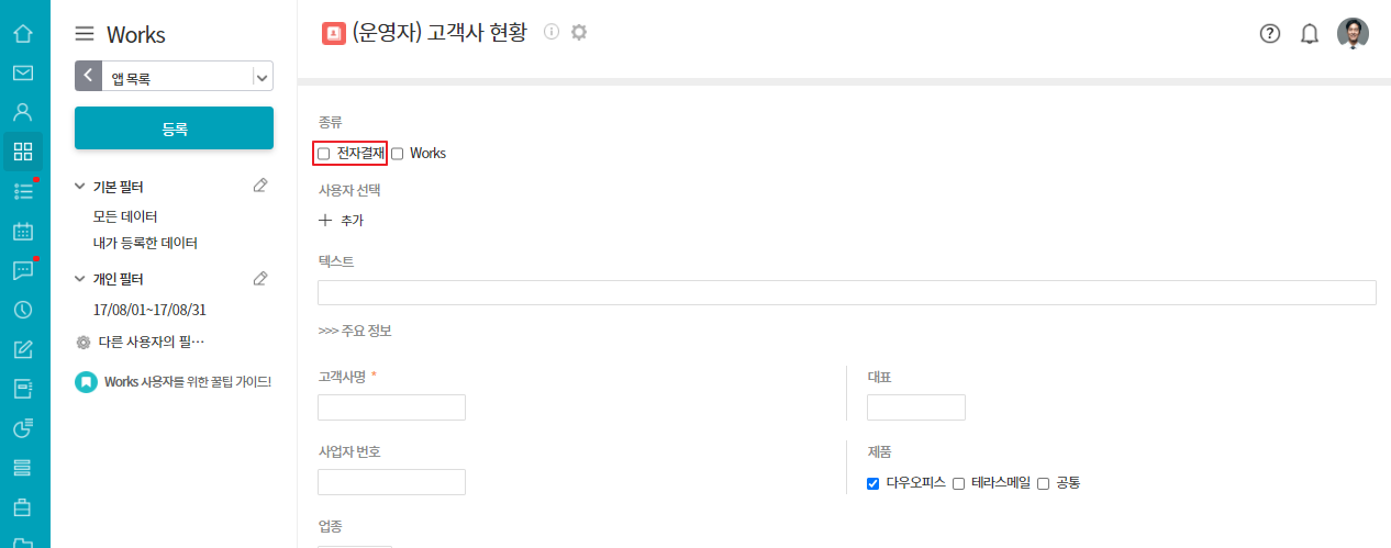 - 항목에 노출 조건 설정을 [종류 항목에 전자결재 선택 시]로 설정한 경우