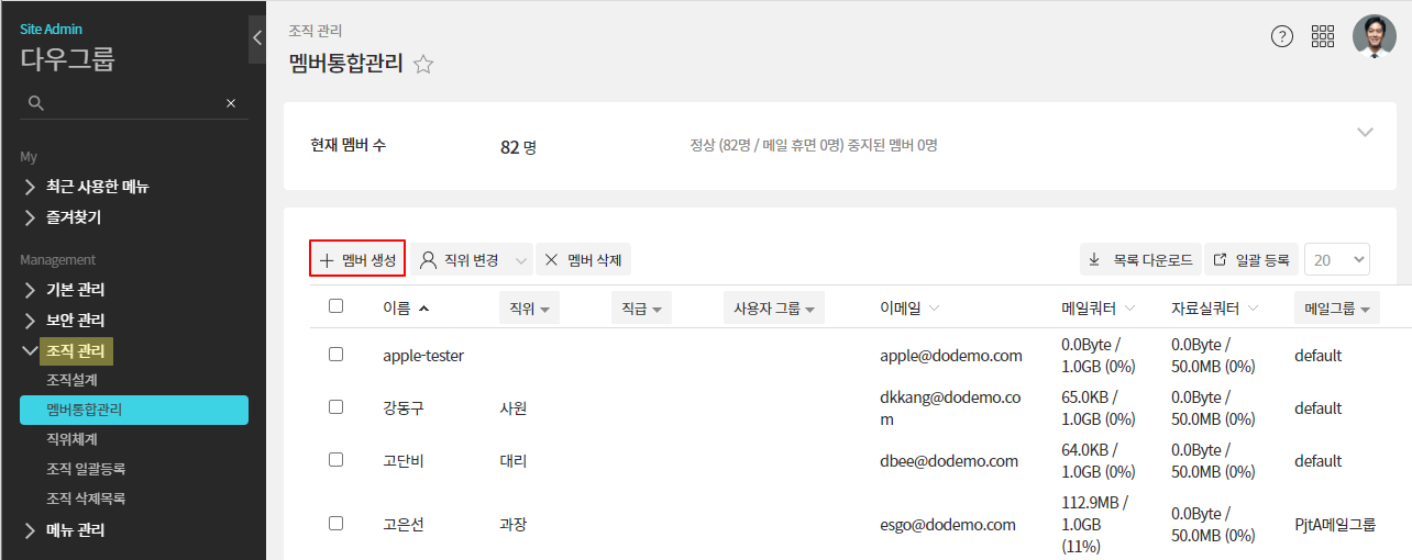 - 관리자페이지(SiteAdmin) ▶ 조직 관리 ▶ 멤버통합관리 ▶ 멤버 생성
