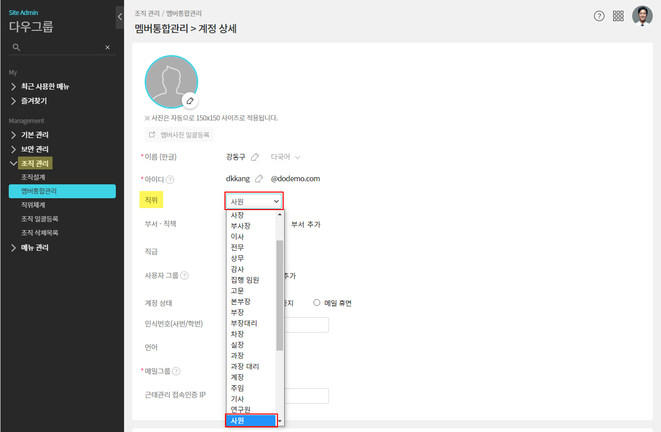 관리자 권한으로 [멤버통합관리]에서 각 멤버의 직위를 설정할 수 있습니다.