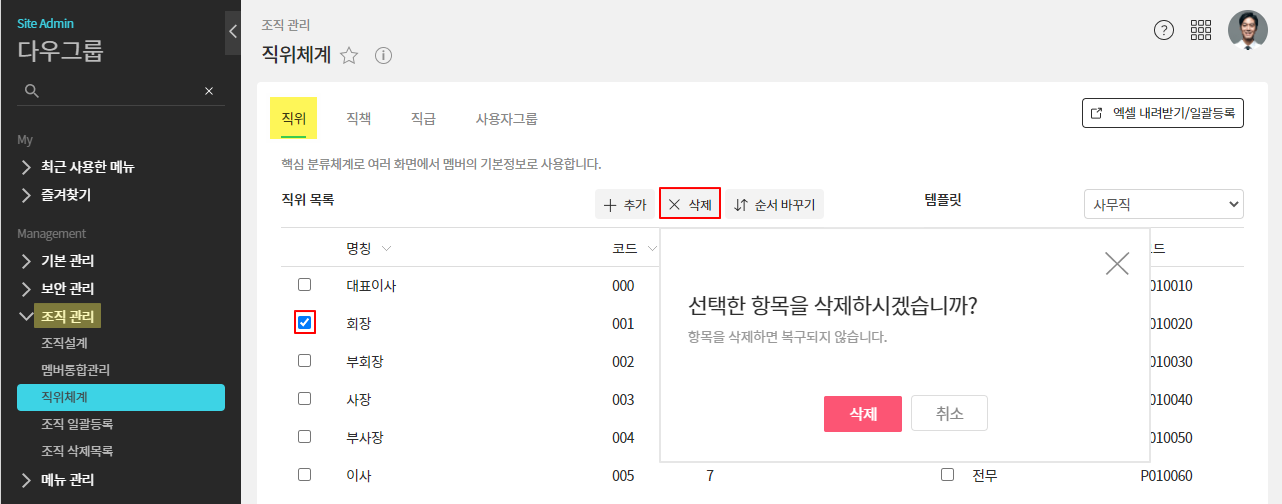 - 관리자페이지(SiteAdmin) ▶ 조직 관리 ▶ 직위체계 ▶ 직위 ▷ 직위 체크 ▷ 삭제