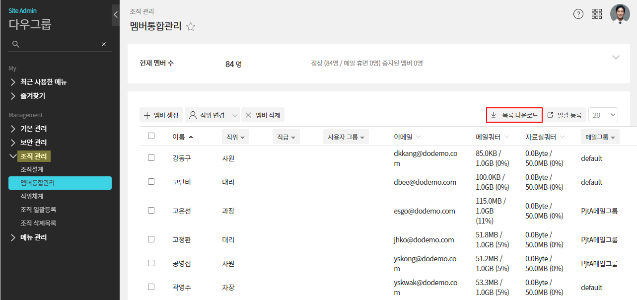 관리자 권한으로 [멤버통합관리] 목록을 다운로드 하여 사용자와 직위를 일괄 확인할 수 있습니다.