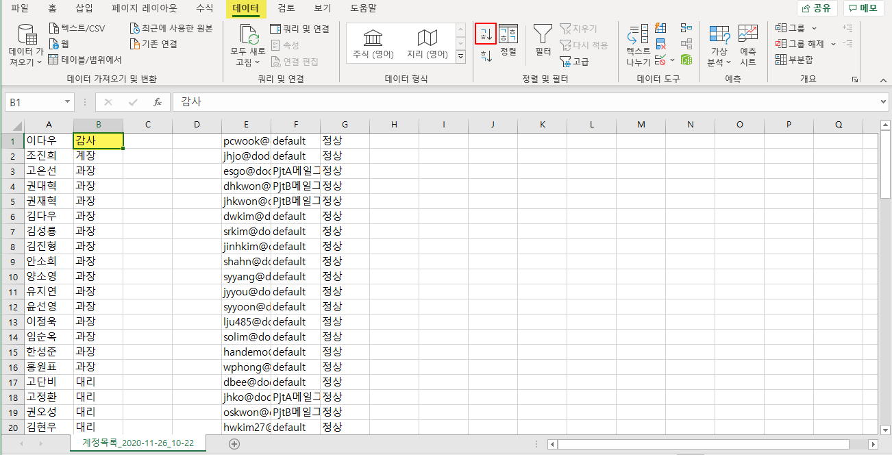 ② 엑셀 파일 ▶ 직위 클릭 ▶ 데이터 ▶ 정렬