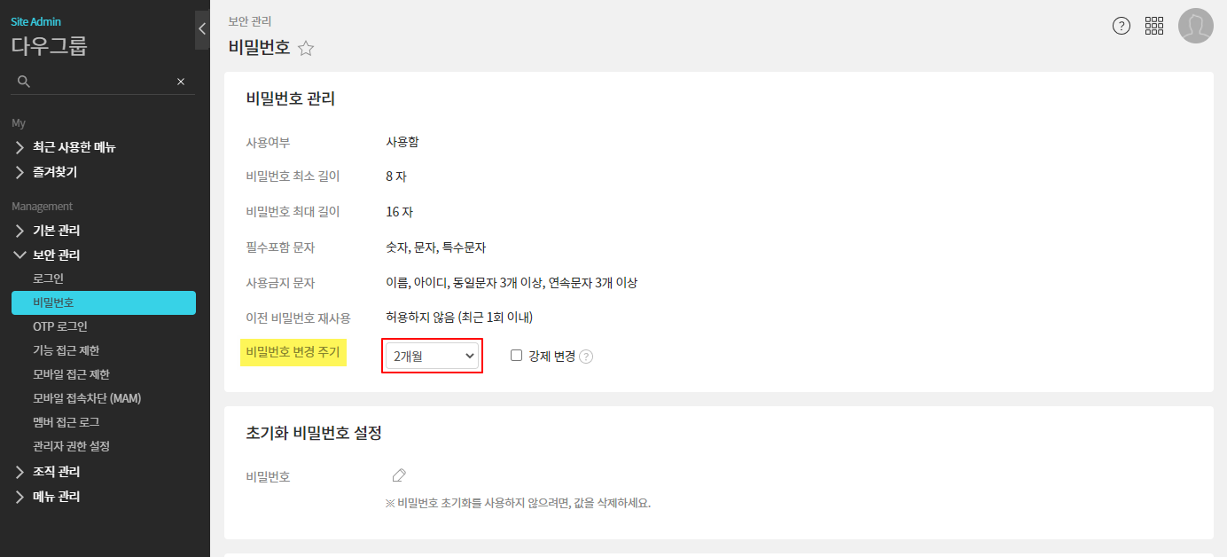 ■ 요약비밀번호 변경 주기는 공통 설정이며, 그룹 별로 나눠서 관리하는 기능은 제공되지 않습니다.