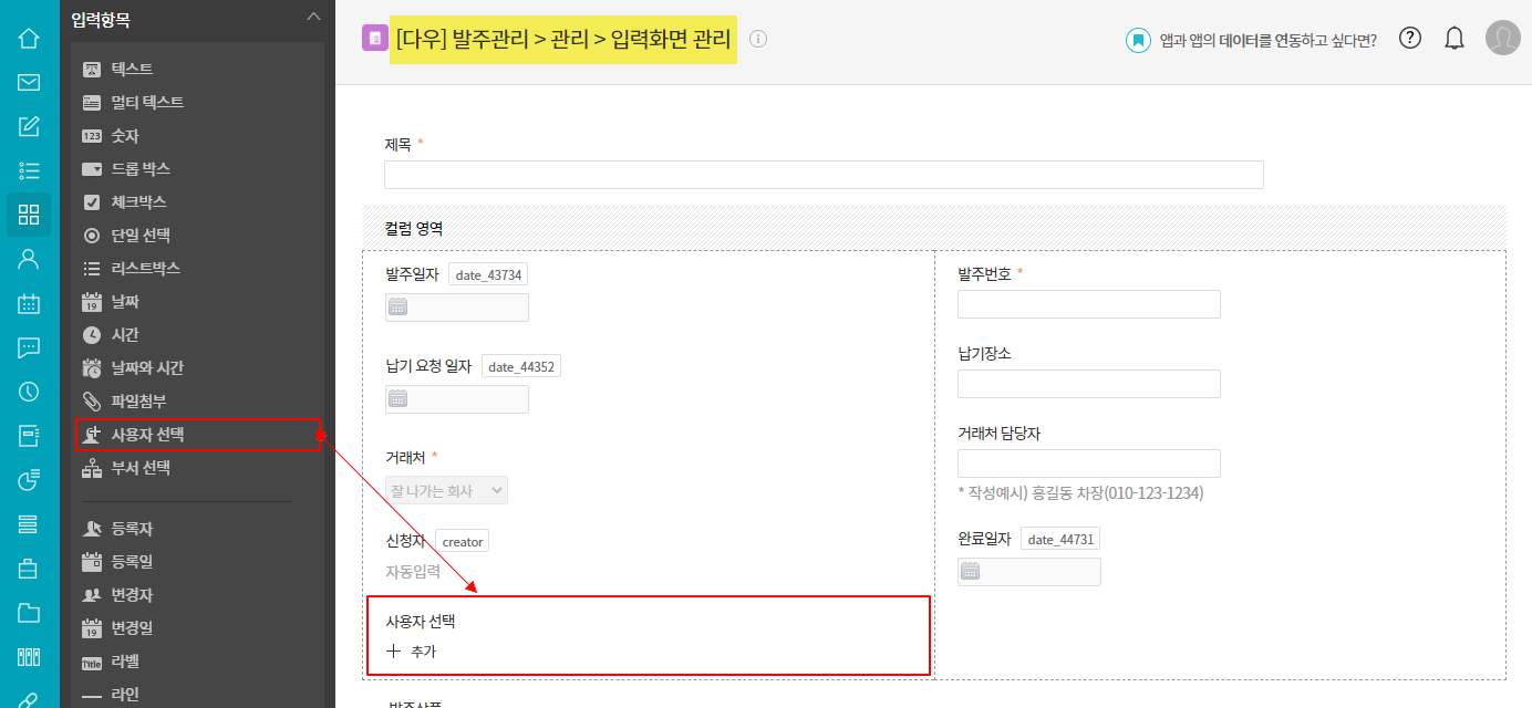 ① 앱 관리 ▶ 입력 화면 ▶ 입력화면 관리 ▷ 우측 입력항목에서 [사용자 선택] 항목 추가