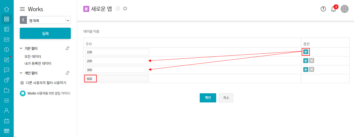 ※ 단, 테이블 내 숫자 항목이 여러 개 있는 경우 숫자 항목 간 자동계산은 할 수 없습니다.