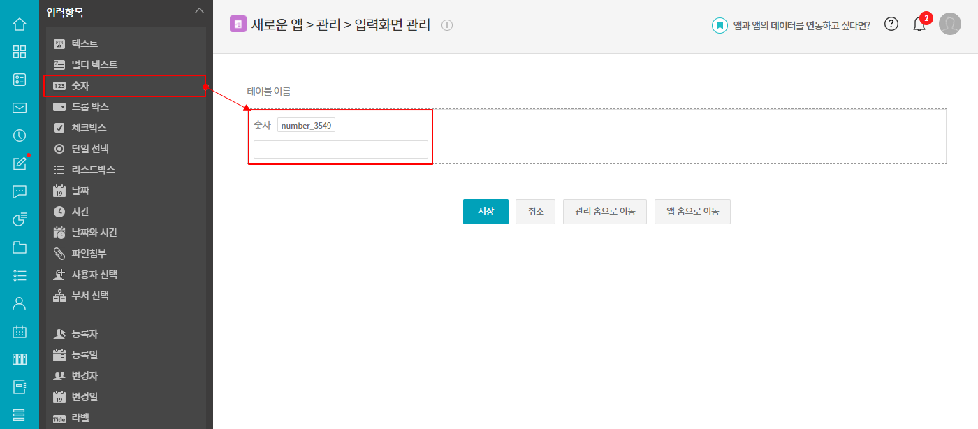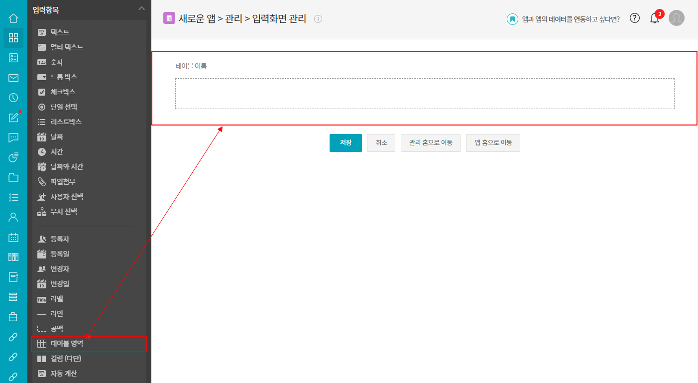 ① 앱 관리 ▶ 입력 화면 ▶ 입력화면 관리 ▷ [테이블 영역] 항목 삽입