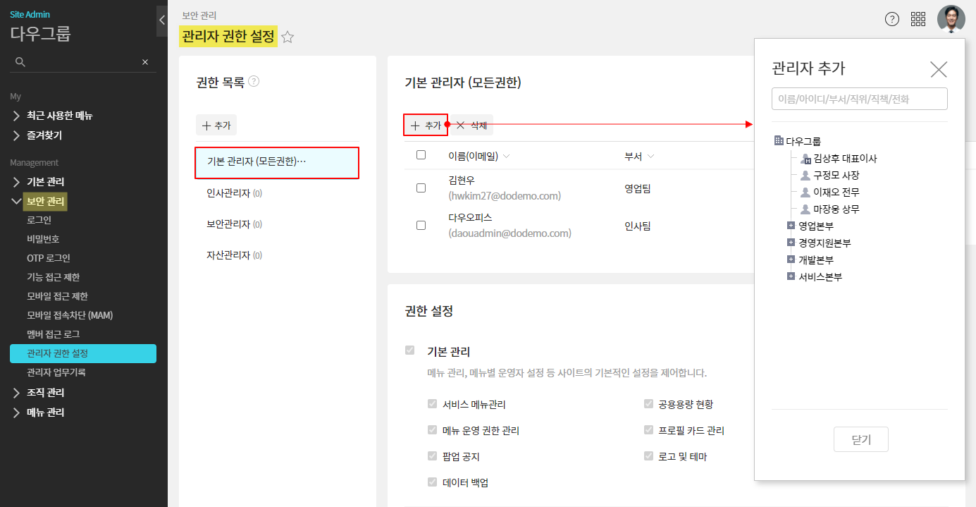 - 관리자페이지(SiteAdmin) ▶ 보안 관리▶ 관리자 권한 설정 ▶ 권한 목록 ▷ 기본 관리자 ▷ + 추가 ▷ 사용자 선택