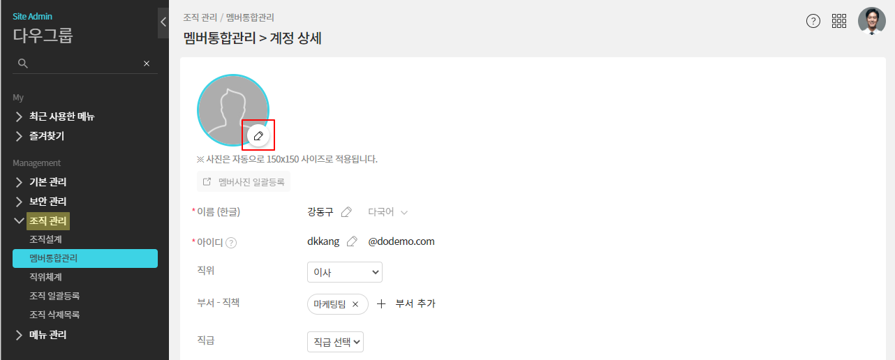 관리자 권한으로 멤버의 프로필 사진을 개별등록 및 일괄 등록할 수 있습니다.