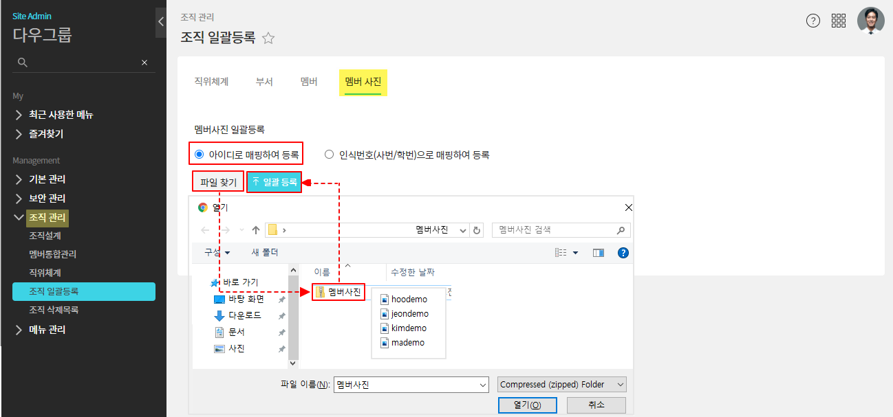 ② 관리자페이지(SiteAdmin) ▶ 조직 관리 ▶ 조직 일괄등록 ▶ 멤버 사진 ▷ 방법 선택 ▷