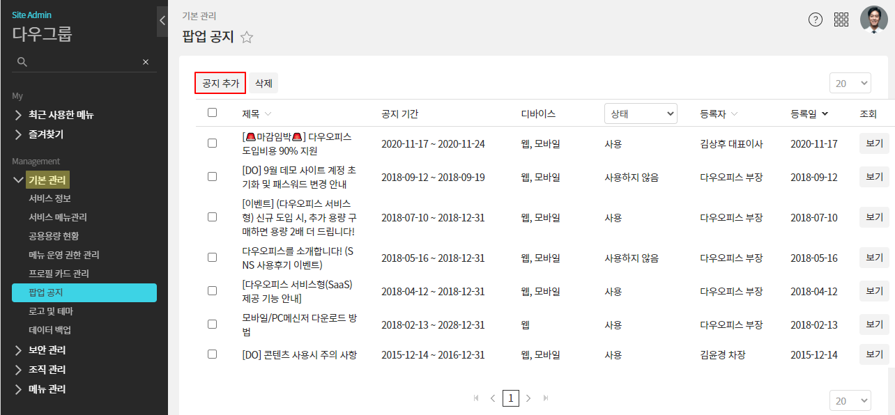 - 디바이스 : 웹과 모바일 모두 공지를 추가하거나 각 디바이스 별로 선택하여 공지할 수 있습니다.