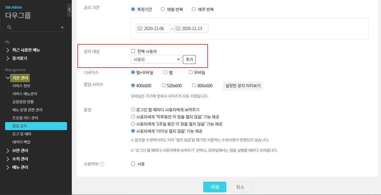 팝업 공지 설정 시 [공지 대상]에 특정 사용자 또는 부서에게만 노출되도록 설정할 수 있습니다.