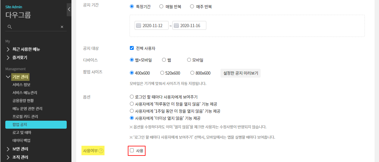 - 옵션 : 사용자에게 팝업 공지 옵션을 제공할지를 선택합니다.