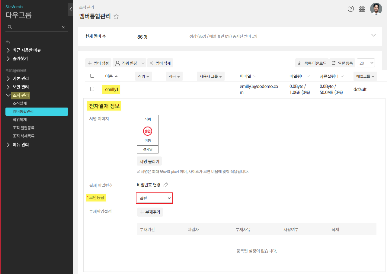 - 관리자페이지(SiteAdmin) ▶ 조직 관리 ▶ 멤버통합관리 ▶ 멤버 클릭 ▷ 전자결재 정보 ▷ 보안등급 변경 ▷ 저장