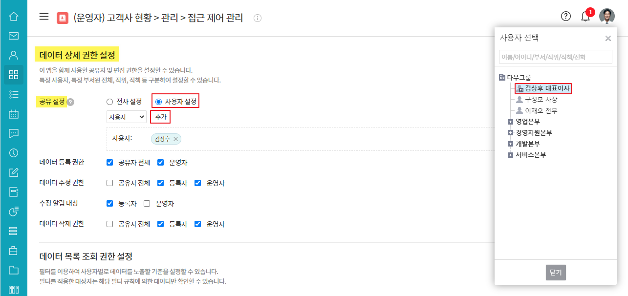 ② 데이터 상세 권한 설정 ▷ 공유 설정 ▷ 사용자 설정 ▷ 추가 ▷ 권한자 클릭 ▷ 저장