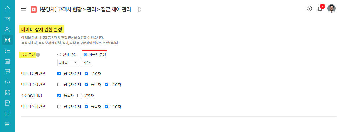 공유 설정에서 사용자 설정으로 선택 시 추가된 사용자와 운영자만 앱을 확인할 수 있습니다.
