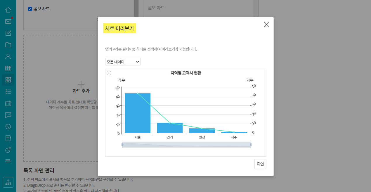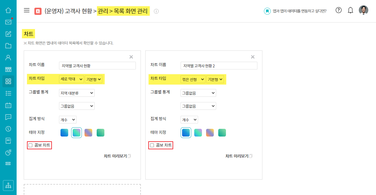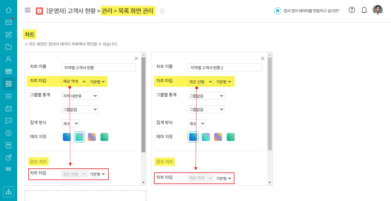 ① works ▶ 관리화면 ▶ 목록 화면 ▷ 차트 추가 ▷ 차트 타입 : 세로 막대 또는 꺾은 선형 ▷ 콤보차트 선택
