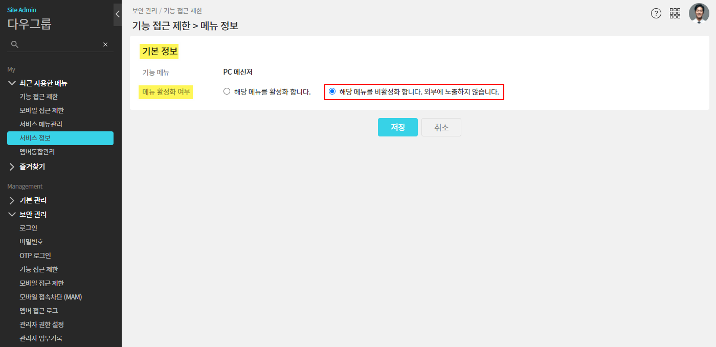 ① 관리자페이지(SiteAdmin) ▶ 보안 관리 ▶ 기능 접근 제한 ▶ PC메신저 설정