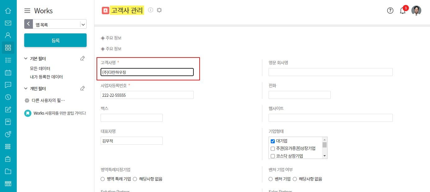 ② 고객 관리앱에서 고객사명 변경 시('주식회사 다란하우징 → (주)다란하우징') 자동반영