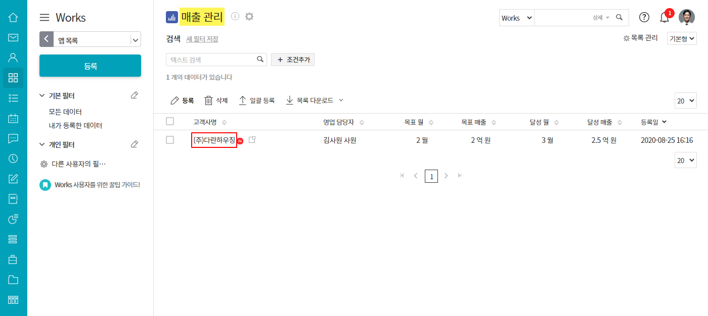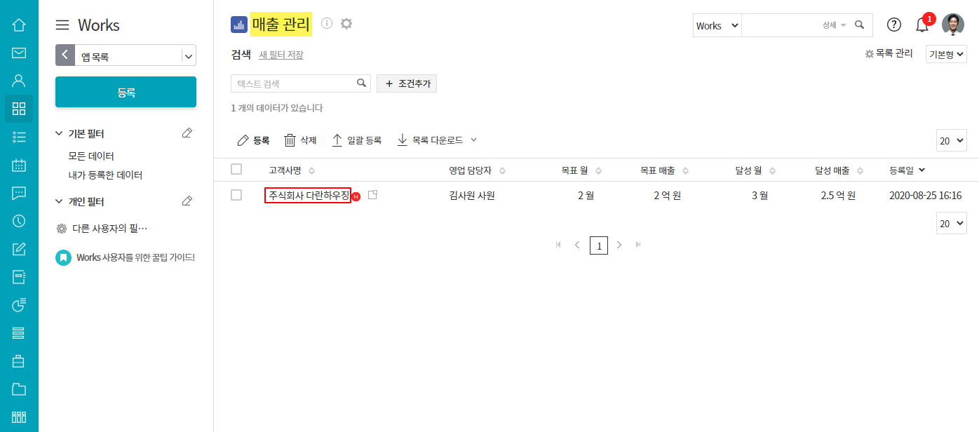 - 매출 관리앱에서 고객사 관리앱을 참조하고 있으며,