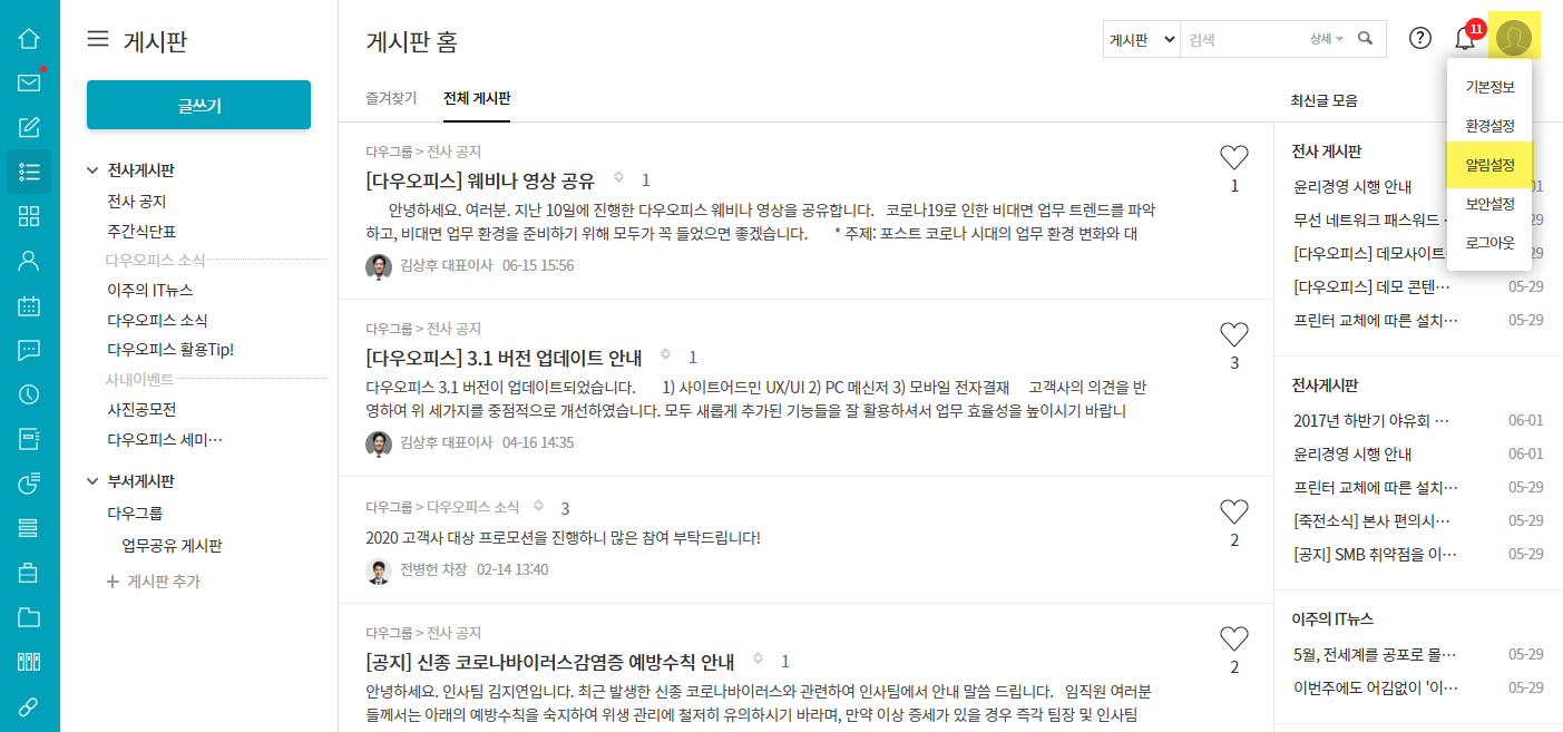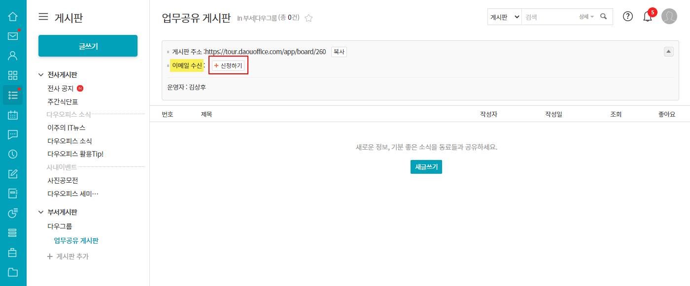 [이메일 수신] 기능으로 신규 게시물이 등록될 때마다 이메일 알림을 받을 수 있도록 설정할 수 있습니다.