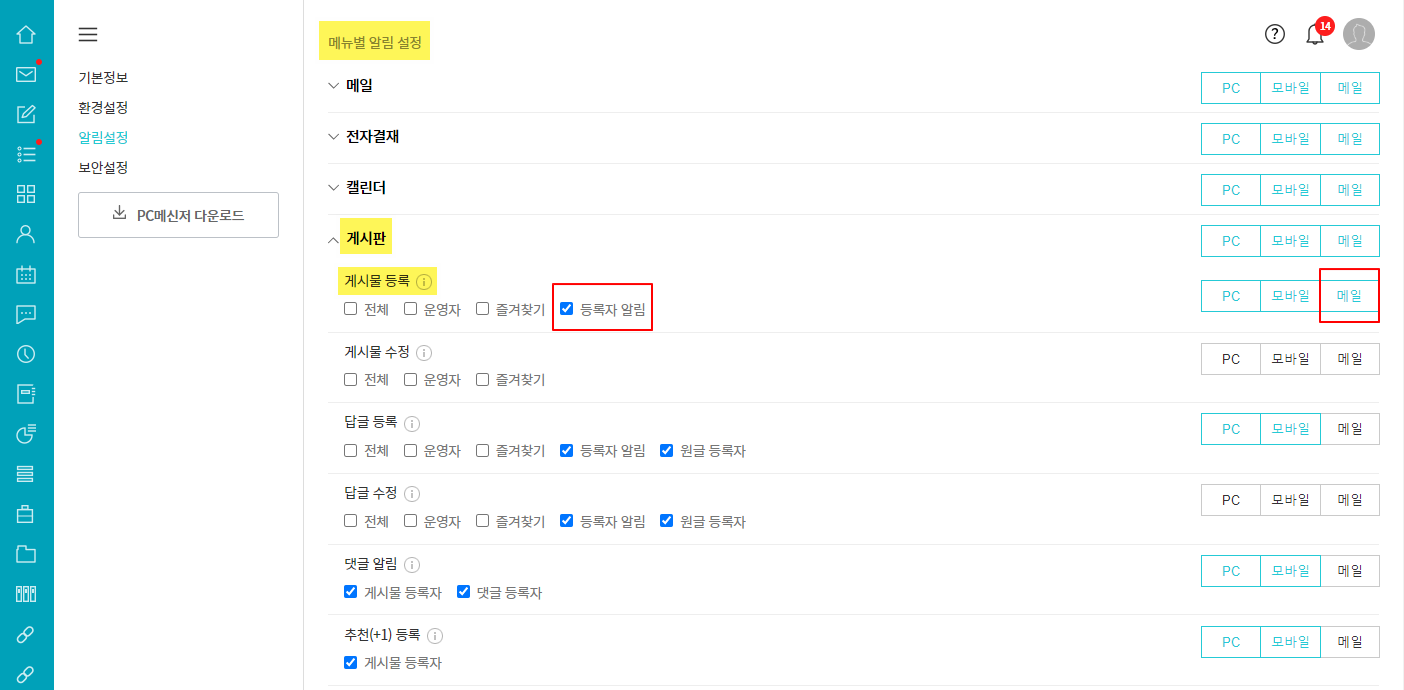 수신자는 알림설정에서 등록자 알림 및 메일에 체크되어 있어야 게시물에 대한 알림을 받을 수 있습니다.