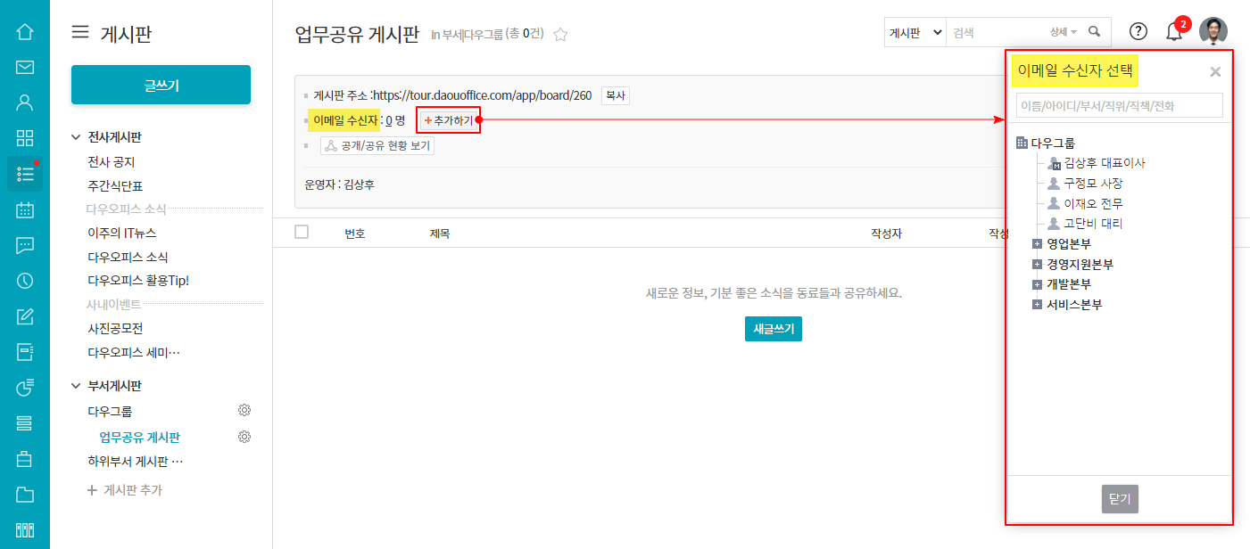 <게시판 구독자 추가하기 : 게시판 운영자/부서장/부부서장>