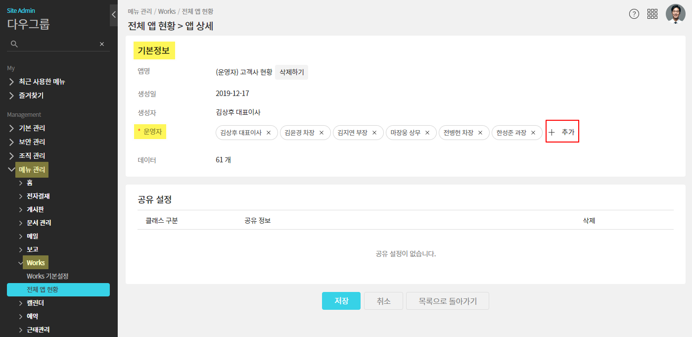 관리자가 Works 앱 운영자를 추가할 수 있습니다.