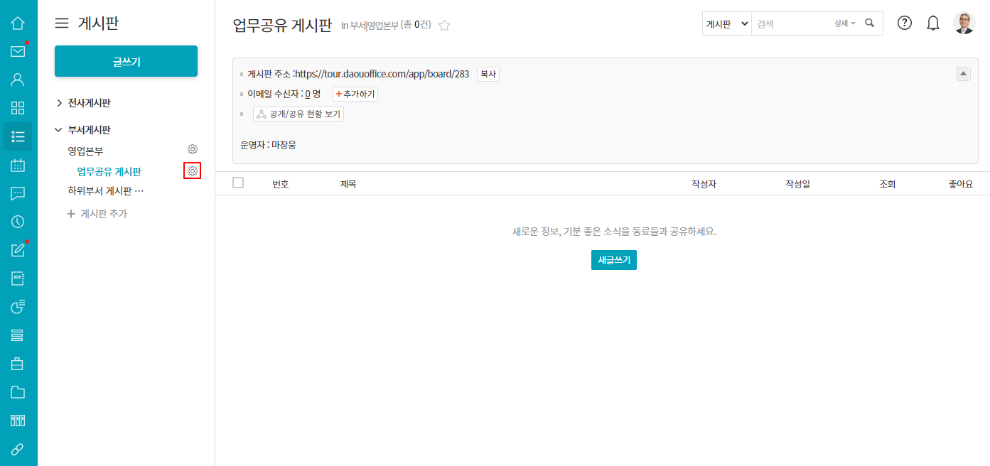 ① 부서게시판 우측의 톱니바퀴 아이콘 클릭