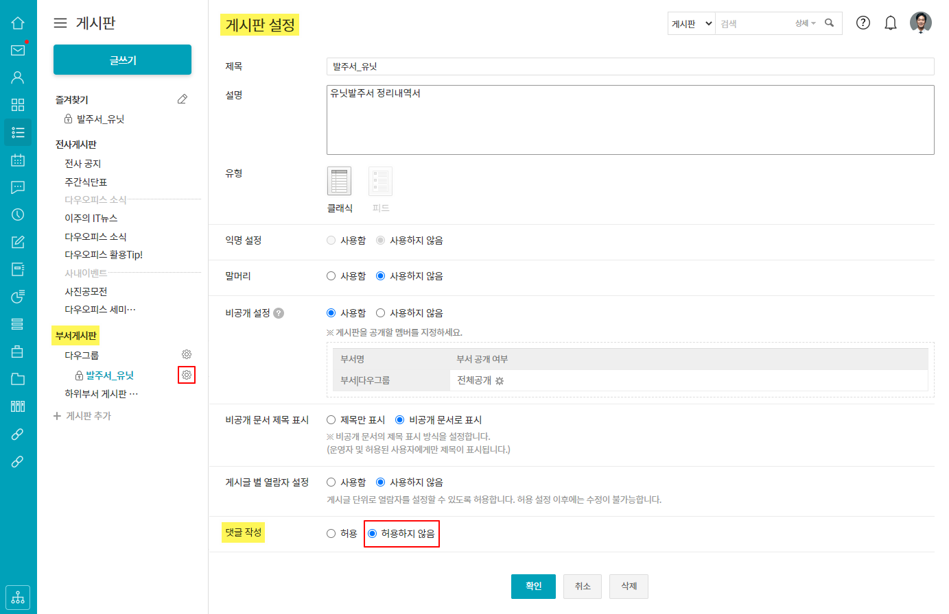 - 게시판 ▶ 부서 게시판 ▶ 부서 게시판명 우측의 톱니바퀴 아이콘 클릭 ▶ 게시판 설정 ▷ 댓글 작성 : 허용하지 않음