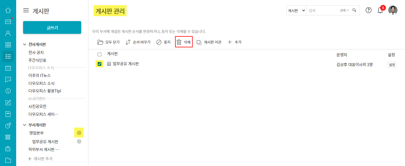 - 부서명 우측 톱니바퀴 아이콘 ▶ 게시판 관리 ▷ 게시판 선택 ▷ 삭제