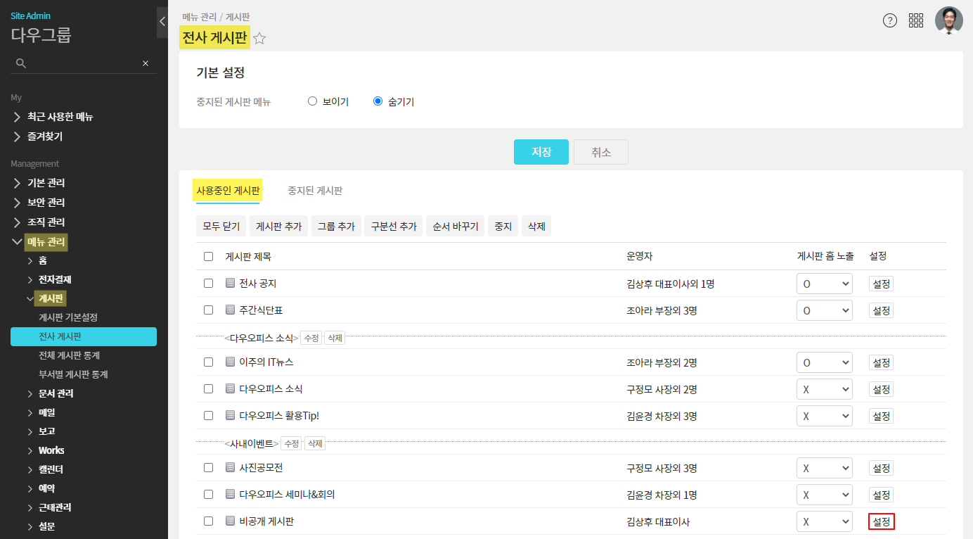 ① 관리자페이지(SiteAdmin) ▶ 메뉴 관리 ▶ 게시판 ▶ 전사 게시판 ▷ 사용중인 게시판 ▷ 비공개 게시판 설정