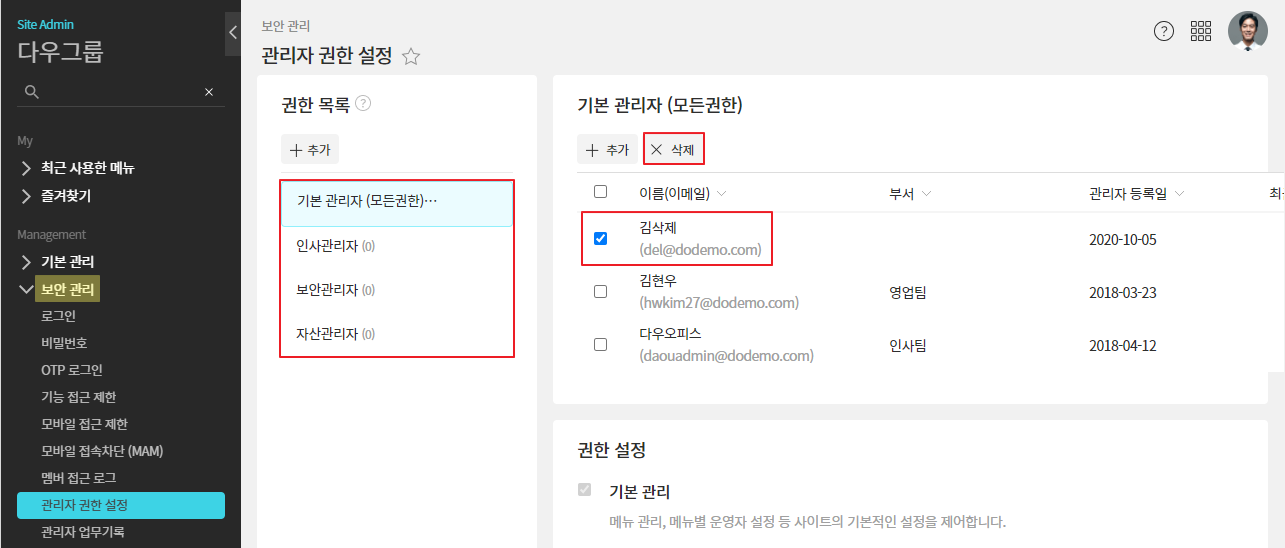 - 관리자페이지(SiteAdmin) ▶ 보안 관리 ▶ 관리자 권한 설정 ▶ 권한 클릭 ▷ 사용자 체크 ▷ 삭제